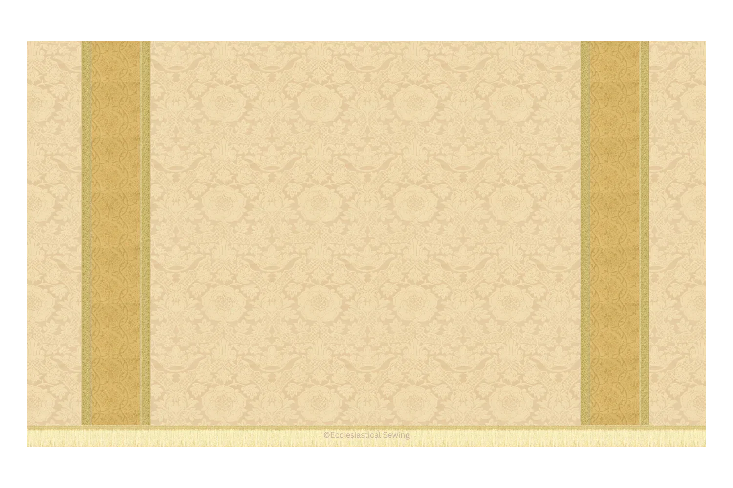 This exquisite full frontal, crafted from our Ivory Lurex St. Margaret Brocade, brings timeless beauty and reverence to the altar. Perfect for festival days such as Easter and Christmas, as well as other solemn occasions calling for white vestments and paraments, the fabric’s delicate Lurex fibers create a graceful shimmer under both soft and brilliant lighting.