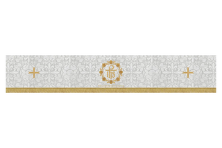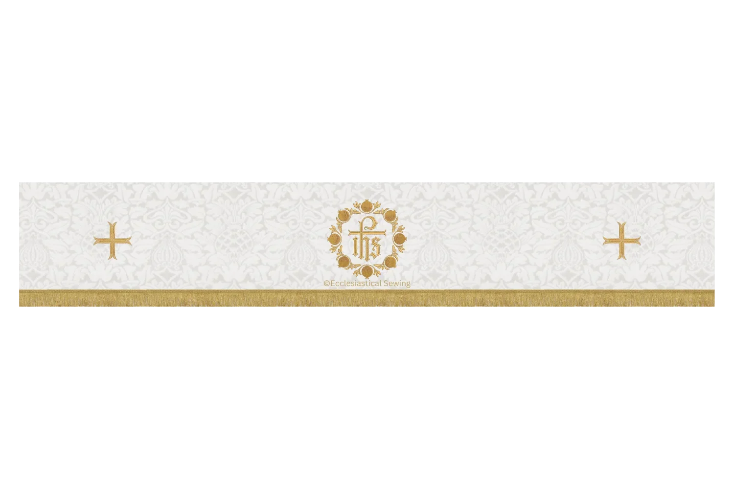 Dayspring Pomegranates are part of the Dayspring Collection of Vestments and altar hangings to be used for Christmas and Easter. The set features delicate machine embroideries with Pomegranate motifs, the Chi Rho Design, and a Moline Cross stitched with gold threads.