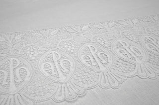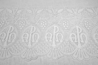 The bright white lace features the Chi-Rho symbol prominently centered within Alpha and Omega emblems, beautifully framed by intricate wheat and grape motifs, symbols of Christ, the Eucharist, and the eternal Church.