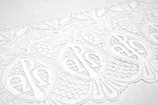The wide scalloped lower edge adds a graceful, ornate finish, while the straight upper edge allows for easy attachment to garments or linens.