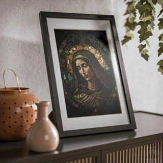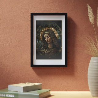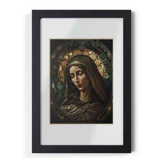 Divine Inspiration: Stained Glass Mother Mary Framed Print Find inspiration in the love and guidance of Mother Mary with this beautiful framed print in a stained glass style. The intricate details and vibrant colors capture the essence of this beloved figure, making it a powerful piece of religious art. Printed on high-quality paper and framed in a classic wooden frame, this picture will bring peace and comfort to any room. Order now and let the divine presence of Mother Mary guide your heart. Prints with a black Perspex frame compliment any interior style with elegance. A white inner matboard keeps everything looking sleek and polished. Pick from multiple sizes and turn it any way you want. .: Materials: black MDF frame and backing, clear Perspex insert cover .: Four sizes to choose from .: 200 gsm, FSC-certified paper .: White inner matboard. Made to Order. Please Allow 3-8 Extra Days to Ship.