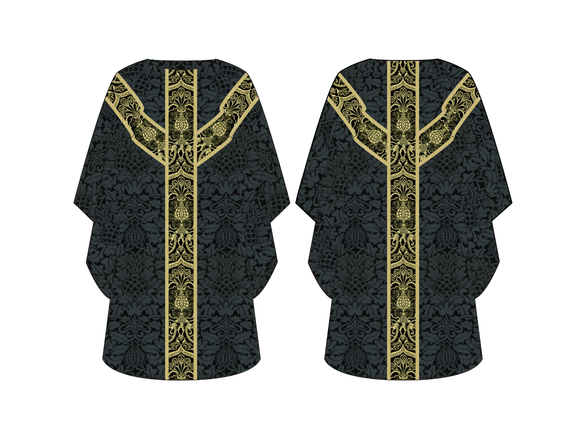 Crafted from rich Black European Brocade, this Gothic-style chasuble features black and gold orphrey bands in a traditional cross design, outlined with black and gold dice braid trim. The balance of deep black and radiant gold embodies the mystery of sorrow and hope, death and resurrection — a visual meditation on Christ’s Passion and triumph over the grave.