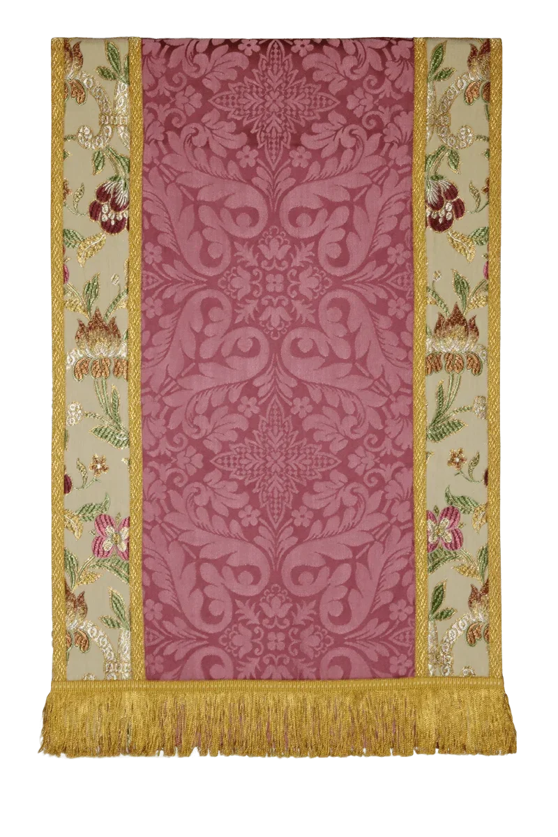 Rose vestments and paraments are used during the third week in Advent and the fourth week in Lent for Gaudete and Laetare Sundays. This pulpit fall is made using a true Liturgical Rose color. (It is not a Peptobilmol or bubble gum pink stole). This Rose face fabric has tapestry on either edge and gold metallic galloon trim. This combination makes this piece quite luxurious. Tapestry motif placement may vary slightly with each pulpit fall, as each is hand made. These are not mass produced paraments, but quality handcrafted items that are made to be worn and last for years with proper care.
